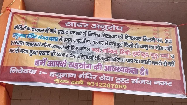 ਸਭ ਤੋਂ ਪਹਿਲਾਂ ਨਵਰਾਤਰੇ ਤੋਂ ਬਾਅਦ ਹਨੂੰਮਾਨ ਮੰਦਿਰ ਸੰਜੇ ਨਗਰ ਵਿੱਚ ਬਾਹਰਲੇ ਬਾਜ਼ਾਰ ਤੋਂ ਖਰੀਦੀ ਮਠਿਆਈ ਜਿਵੇਂ ਲੱਡੂ, ਗੁਲਦਾਨਾ, ਬਰਫ਼ੀ ਆਦਿ ਨਾ ਚੜ੍ਹਾਉਣ ਦੀ ਅਪੀਲ ਕੀਤੀ ਗਈ ਹੈ।