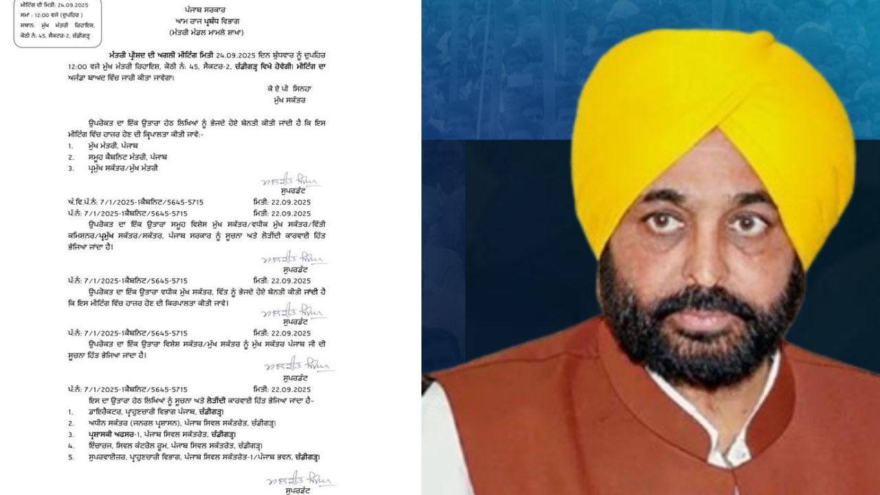 ਮੁੱਖ ਮੰਤਰੀ ਭਗਵੰਤ ਨੇ 24 ਸਤੰਬਰ ਨੂੰ ਪੰਜਾਬ ਕੈਬਨਿਟ ਮੀਟਿੰਗ ਬੁਲਾਈ ਹੈ।